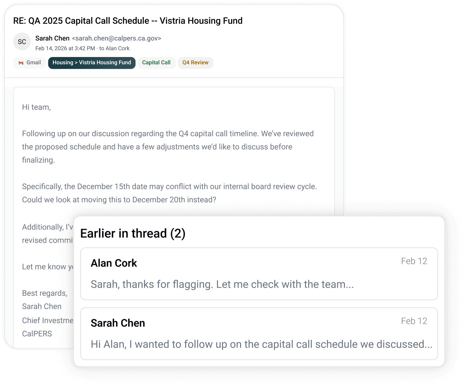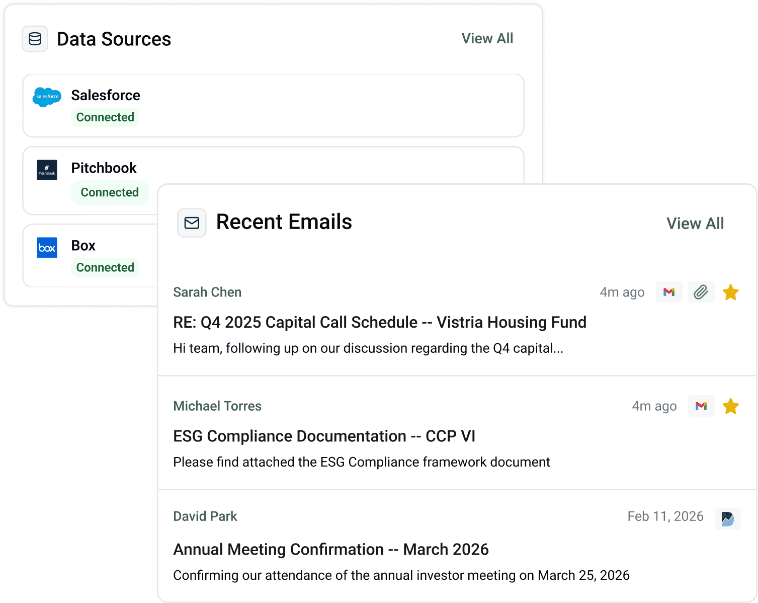 Before every meeting, Virgil surfaces full history: past interactions, outstanding commitments, portfolio overlap, and recent news